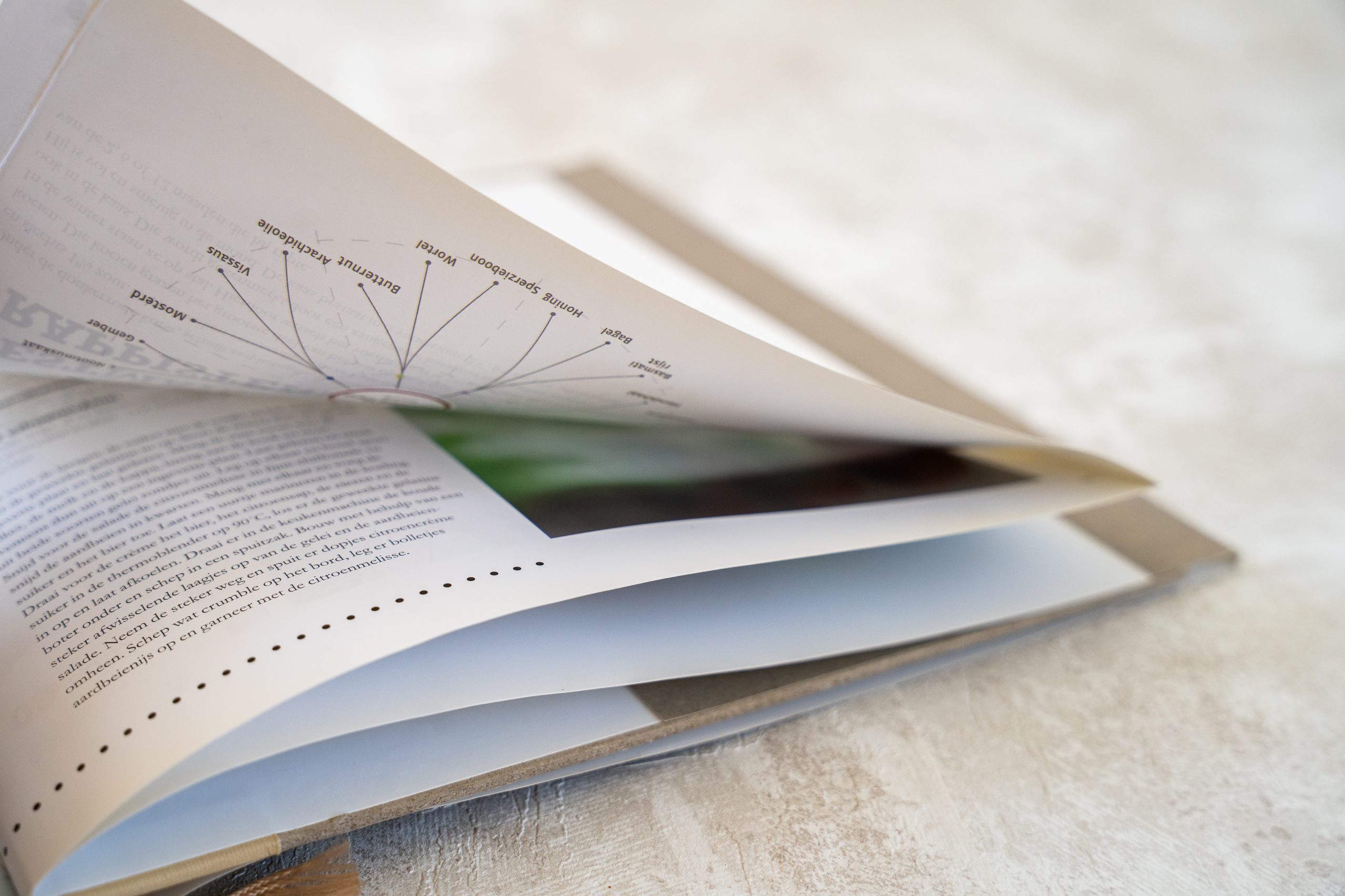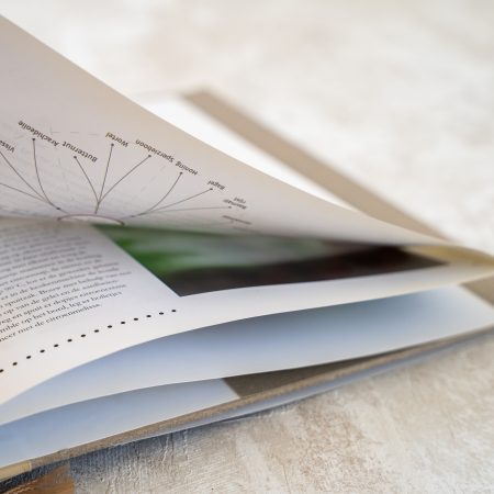 Hardcover met stofomslag, gedrukt op eska-board met preeg, foliedruk en omplakt met linnen